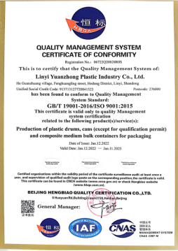 為保證產品質量達標,使管理規范化、程序化,公司于2017年5月獲通過了 ISO9001:2015中國質量體系認證;2017年3月獲得了《全國工業生產許可證》; 2017年9月通過了中華人民共和國江蘇出入境檢驗檢疫局《出口危險貨 物包裝容器質量許可證》認證,于2019年8月獲得由中國船級社簽發的型式